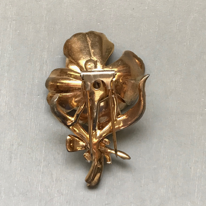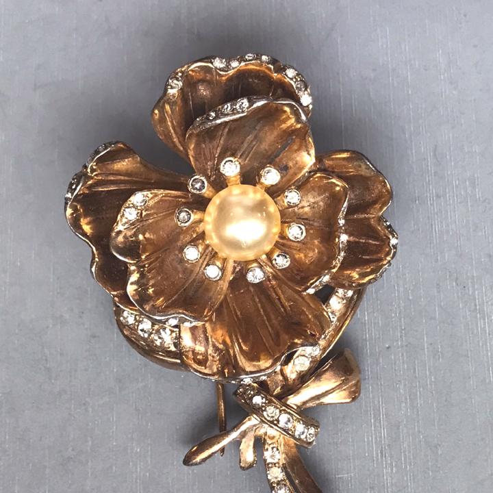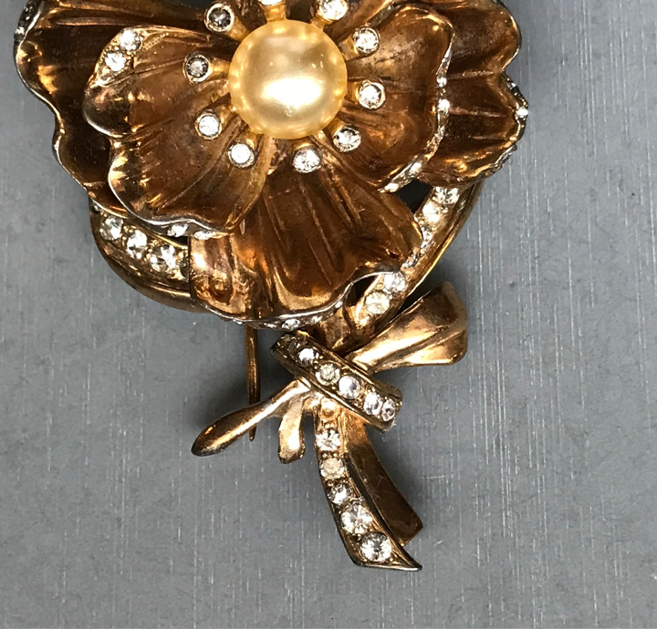 DescriptionDEJA flower fur clip with two rows of open fluted and curved petals in lovely yellow gold plated metal. A glass pearl center is surrounded with clear rhinestones and they are also lining the edges of the petals and the stem. Signed "Deja" on the back, this was from the 1940s and it is 2-1/2" by 1-3/4". Some of the rhinestones are slightly graying but the glass pearl is just fine. I suspect this is a design inspired by a similar DeRosa flower clip. View View View View Product #42918