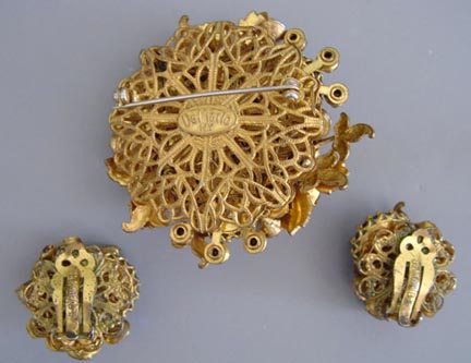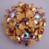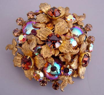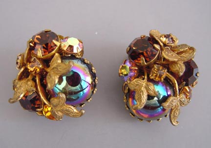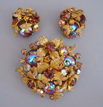 DEMARIO amber and aurora colored rhinestones, glass cabochons brooch and earringsView View View Product #26796 All items in excellent vintage condition unless otherwise noted.