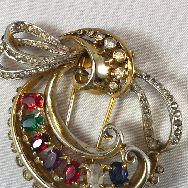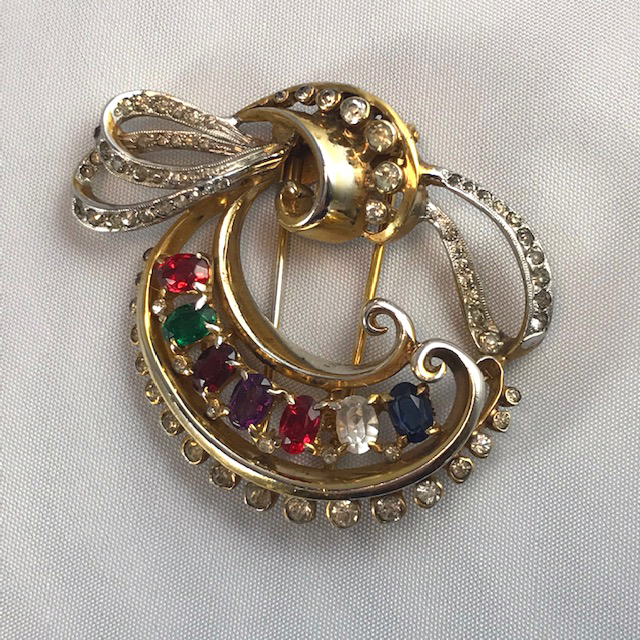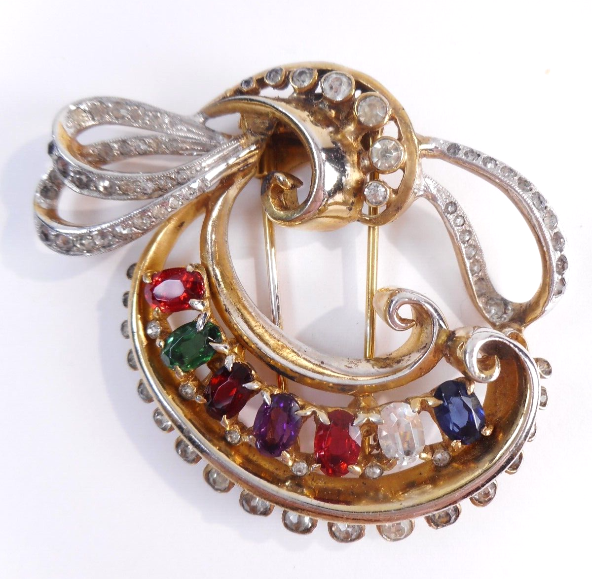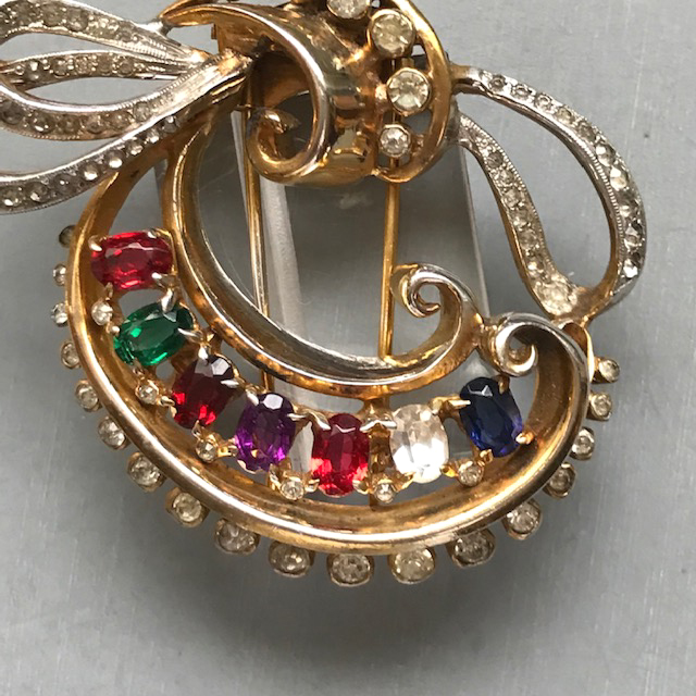 Description DEROSA acrostic "Regards" rhinestone bow and swirl fur clip, a beautiful classic. The rhinestones are colors that represent the gem stones ruby, emerald, garnet, amethyst, ruby, diamonds and sapphire which acrostically spells out the word "regards". Typical of the wonderful details DeRosa used, there is a row of clear rhinestones around the edge of the clip. This clip is 2" by 1-3/4" and it was made in about 1949. DeRosa made other designs of these romantic acrostic pieces that spelled out messages of love and regard.