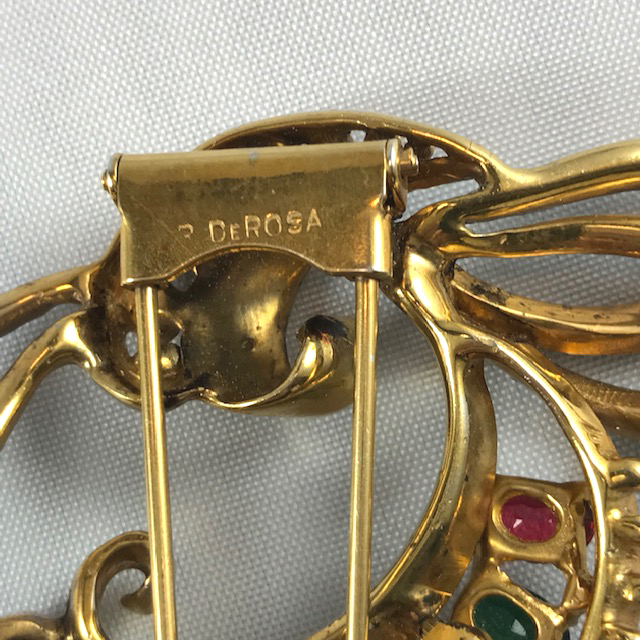 Other DeRosa acrostics pieces can be seen in the book, "Jewels of Fantasy" by Deanna Cera on page 158, and in the book, "Swarovski, a Celebrating a History of Collaborations in Fashion, Jewelry, Performance & Design" on page 149. A DeRosa brooch similar to this one is featured there, which indicates that DeRosa used Swarovski crystals in at least some of their pieces. View View View View Product #42467
