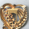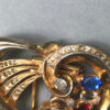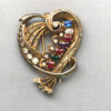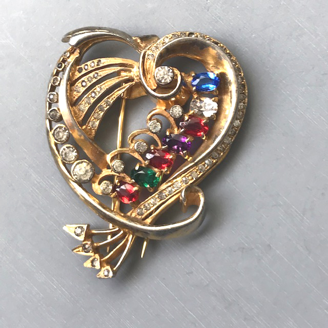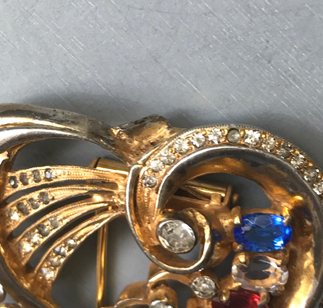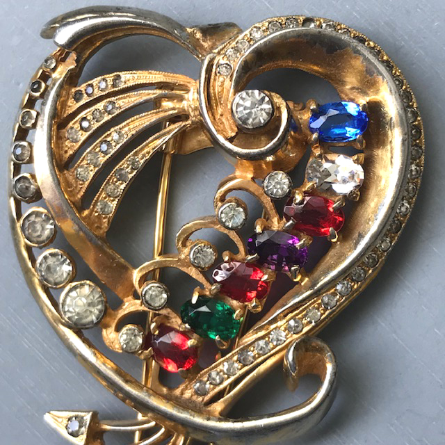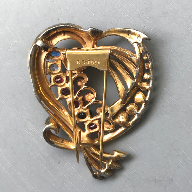 DEROSA acrostic "Regards" rhinestone fur clip in gold plated setting made in the 1940s, as isThe rhinestones are colors that represent ruby, emerald, garnet, amethyst, ruby, diamonds and sapphire, which acrostically spell out the word "regards". An interesting detail are the three arrows at the bottom of the clip, Cupid's arrows? NOTE: I had another clip like this one, and on it was a small piece in the center of the very top, and that is missing here. You must look closely to see where it was, and it is still lovely, but it is priced as-is for that reason. There is light finish wear as often happens on these older DeRosa pieces and some of the clear rhinestones have grayed with age, so this is priced accordingly. It is still a lovely and wearable piece. Other DeRosa acrostics pieces can be seen in the book, "Jewels of Fantasy" by Deanna Cera on page 158. In the book, "Swarovski, a Celebrating a History of Collaborations in Fashion, Jewelry, Performance & Design" on page 149, a DeRosa brooch similar to this one is featured, so DeRosa used the high quality Swarovski crystals in at least some of their jewelry. View View View View Product #41856 All items in excellent vintage condition unless otherwise noted.