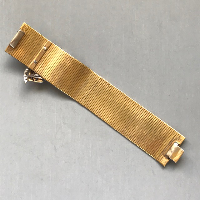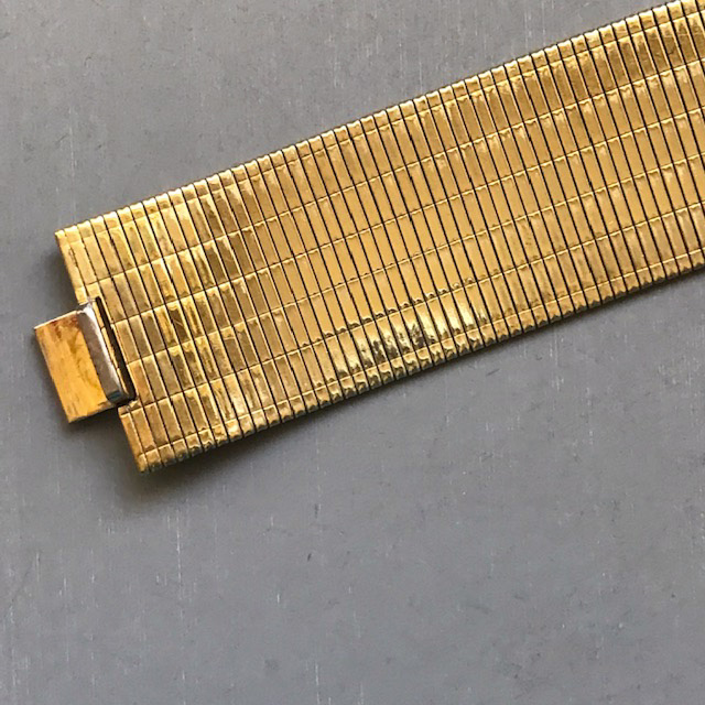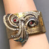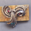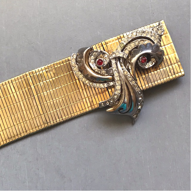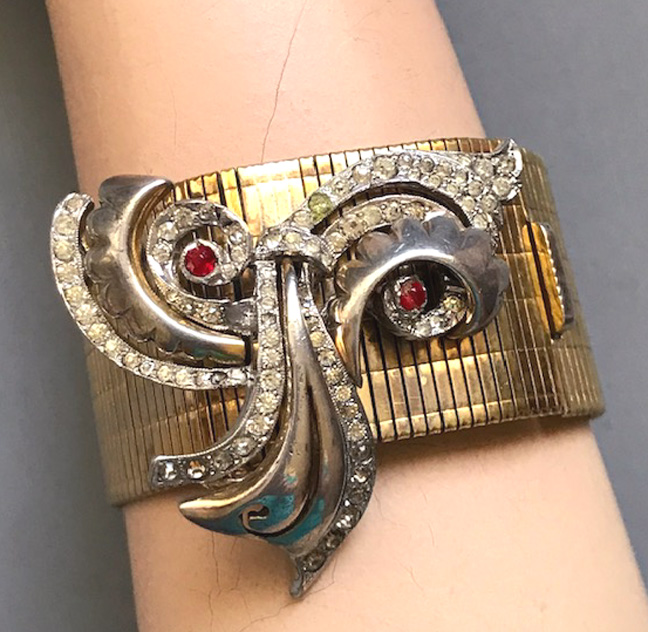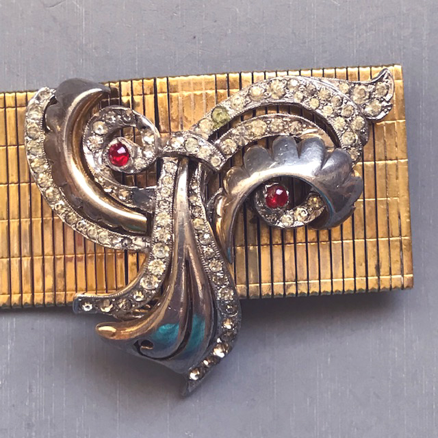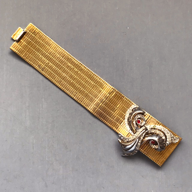 Description DEROSA attributed very unusual bracelet with a red and clear rhinestone swirling silver center element on the front of a wide gold plated mesh band. The front element is 2-1/4" by 2" and the band is 6-78" wearable length by 1-1/8" wide.