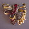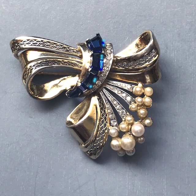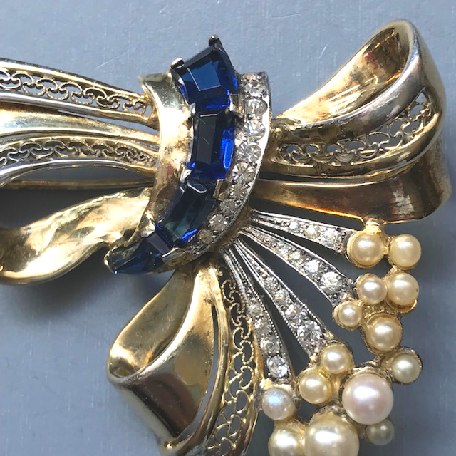 Description DEROSA bow brooch with blue rhinestones, glass pearls and the interesting inset wire work typical of some DeRosa pieces The different sizes of glass pearls add even more interest to the design, as does the swirling movement of the overlapping bows.