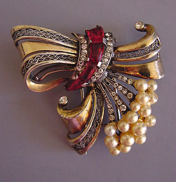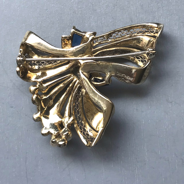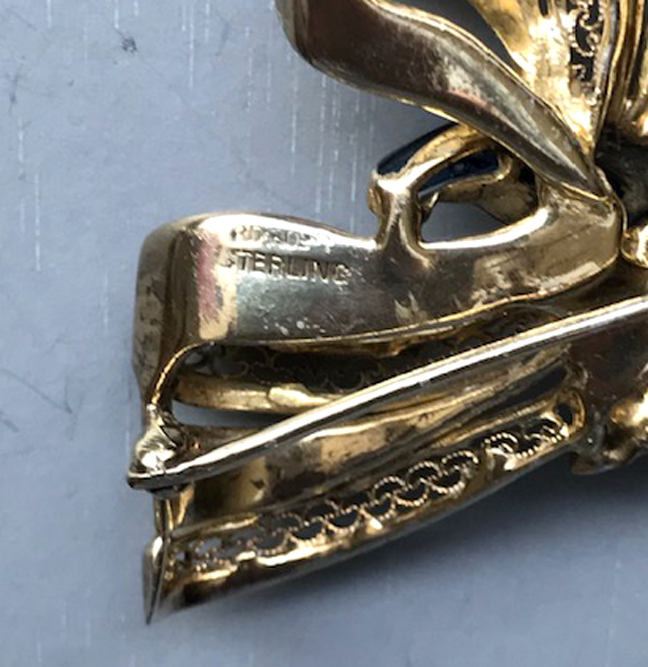 In a gold plated sterling silver setting, it is signed "R DeRosa sterling" on the back and is 2" by 2". Made in the 1940s, it is a lovely example of the high quality of DeRosa jewelry. We once had this same brooch in RED, too, shown here just for fun. View View View View Product #42702