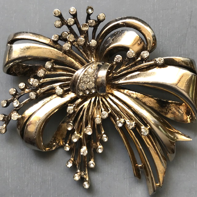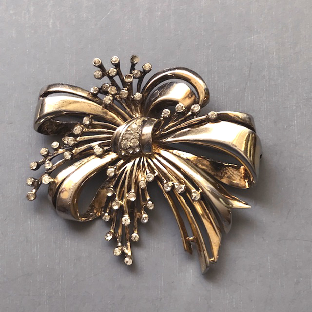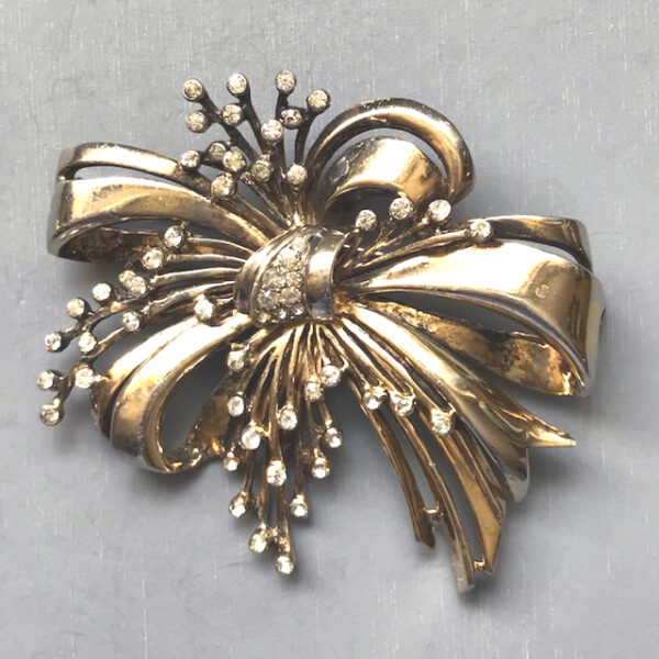 DEROSA bows, ribbons and starburst brooch with clear rhinestones in a gold plated settingProduct #42313 All items in excellent vintage condition unless otherwise noted.