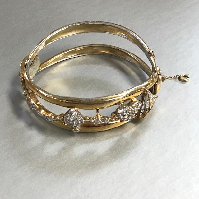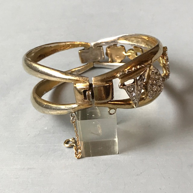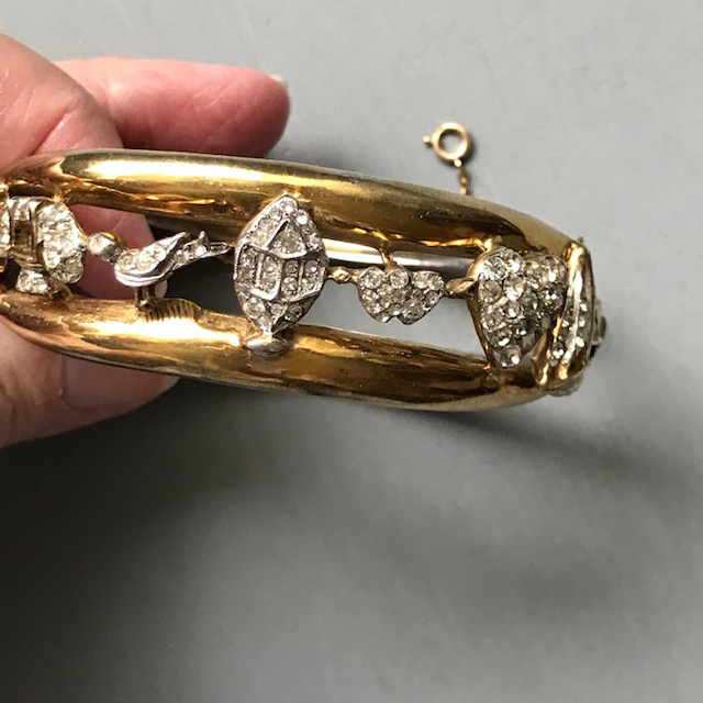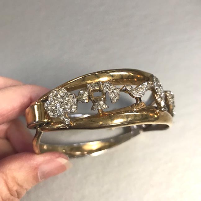 DEROSA rare applied charms bracelet with clear rhinestones in a gold plated sterling silver settingTo read more about DEROSA jewelry click HERE for our reference page and gallery. View View View View View View View View View Product #41654 All items in excellent vintage condition unless otherwise noted.