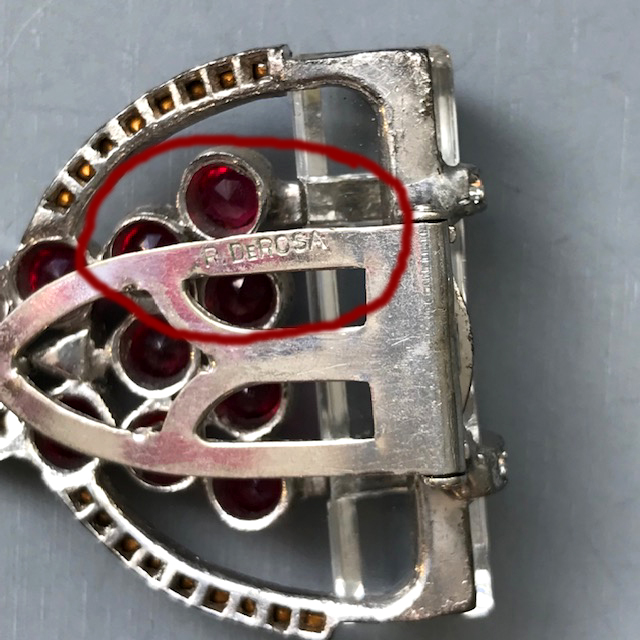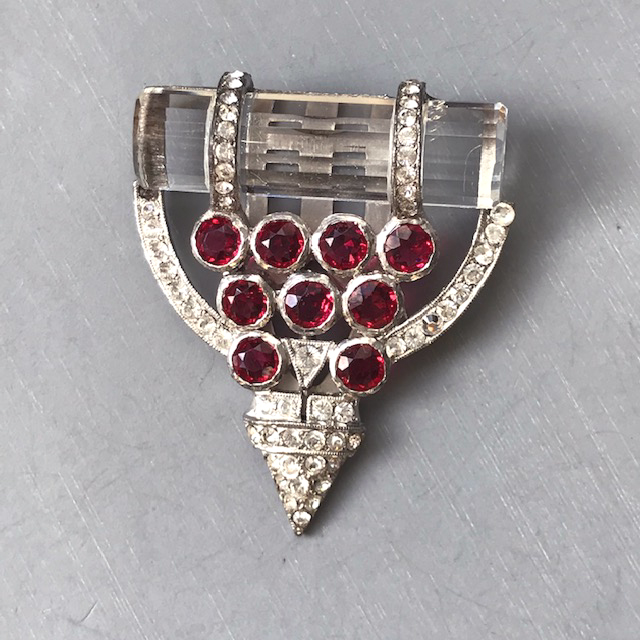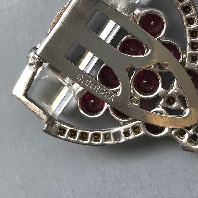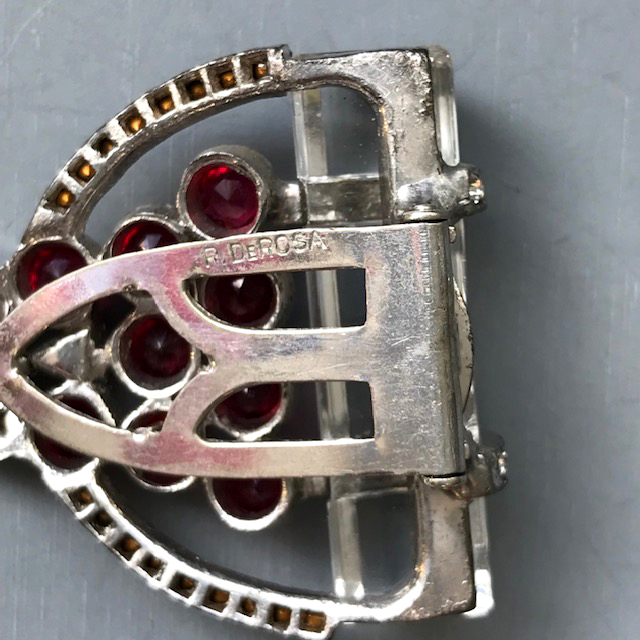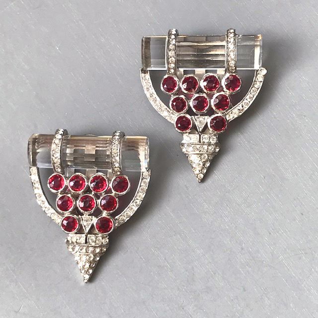 DEROSA pair of dress clips set with red and clear rhinestones and beautiful faceted glass rodsEach is signed "R DeRosa" on the back and each is 1-3/4" by 1-1/4". I think these were made in the late 1930s and like many DeRosa pieces, they are rare. View View View View Product #42192 All items in excellent vintage condition unless otherwise noted.