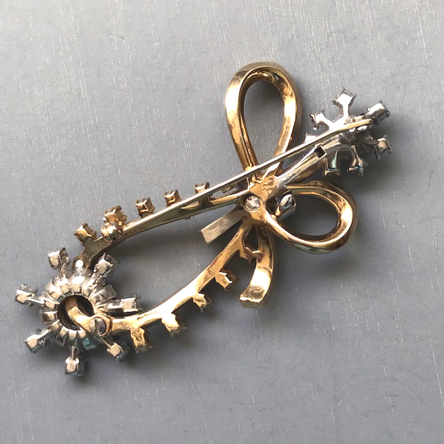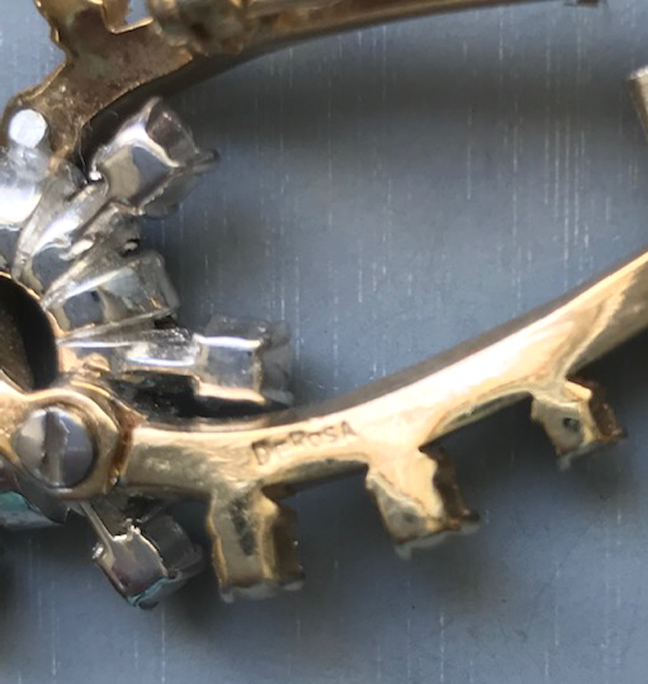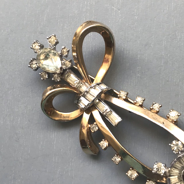 DEROSA comet-like star, bow and circle brooch of clear rhinestones in a gold and rhodium plated settingProduct #42308 All items in excellent vintage condition unless otherwise noted.
