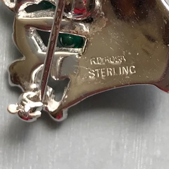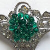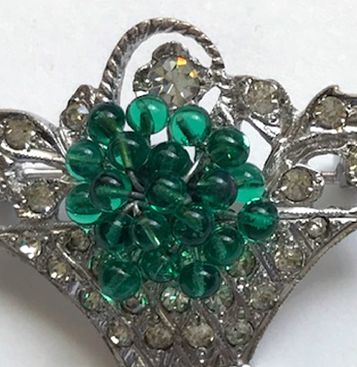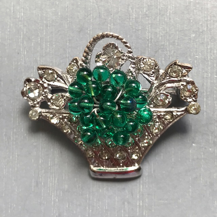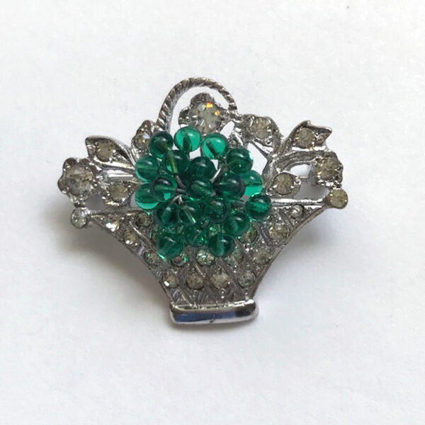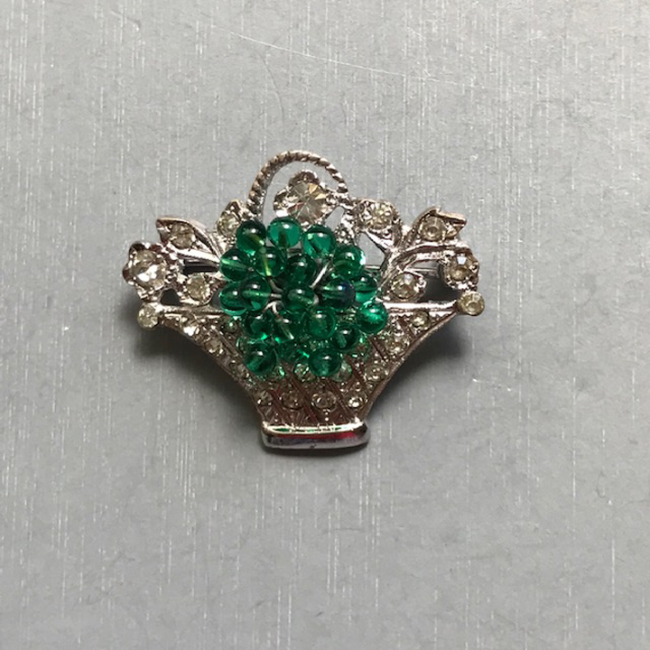 DEROSA dainty basket pin with green glass beads and clear rhinestones in a sterling silver settingProduct #42563 All items in excellent vintage condition unless otherwise noted.