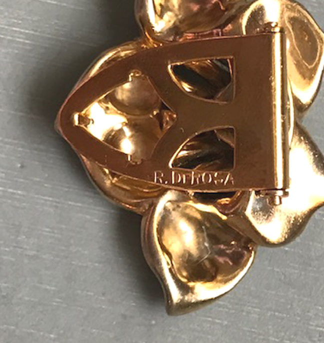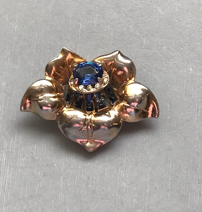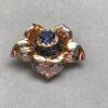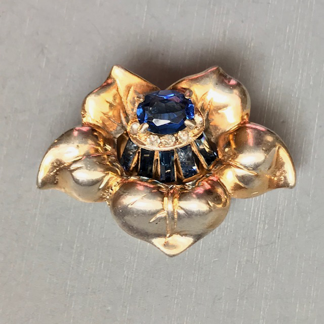DEROSA dainty blue rhinestone flower dress clip with a sapphire blue rhinestone center, blue baguettes and clear rhinestonesProduct #42491 All items in excellent vintage condition unless otherwise noted.