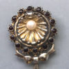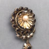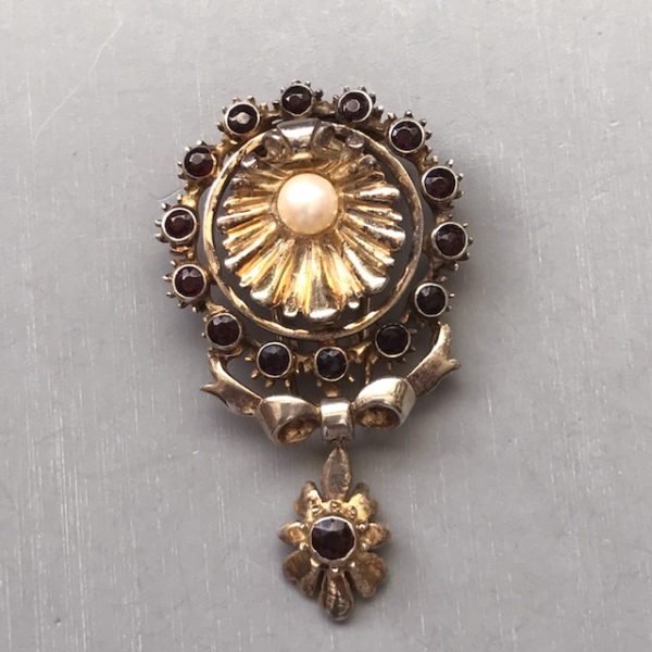 DescriptionDEROSA dark wine red rhinestones fur clip with a glass pearl in the center set in gold washed sterling silver, 2-1/8" by 1-1/8".
