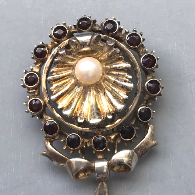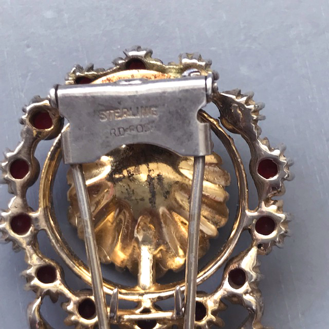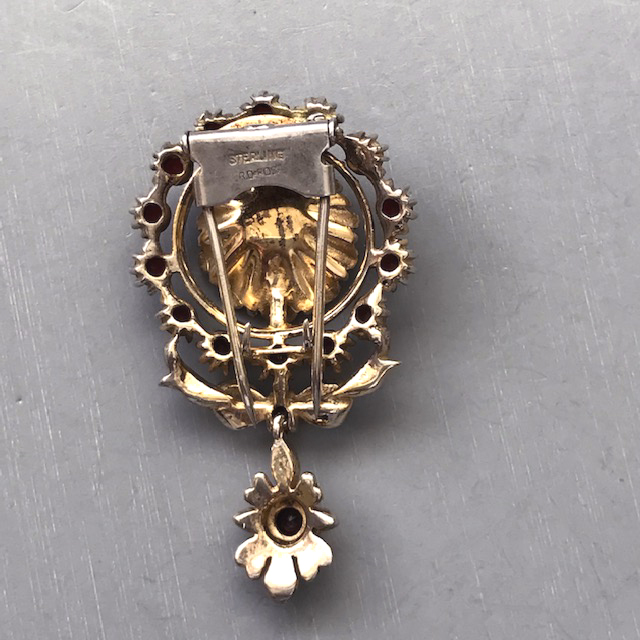 At the bottom of the top element is a charming bow and ribbon, and suspended from it is another small bow shape with a dark red rhinestone center. It is signed on the back "R DeRosa, sterling", and it is from the 1940s. View View View View Product #42189
