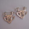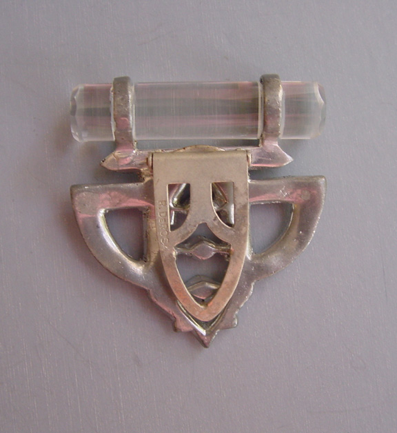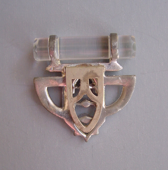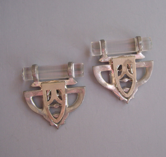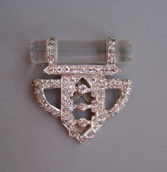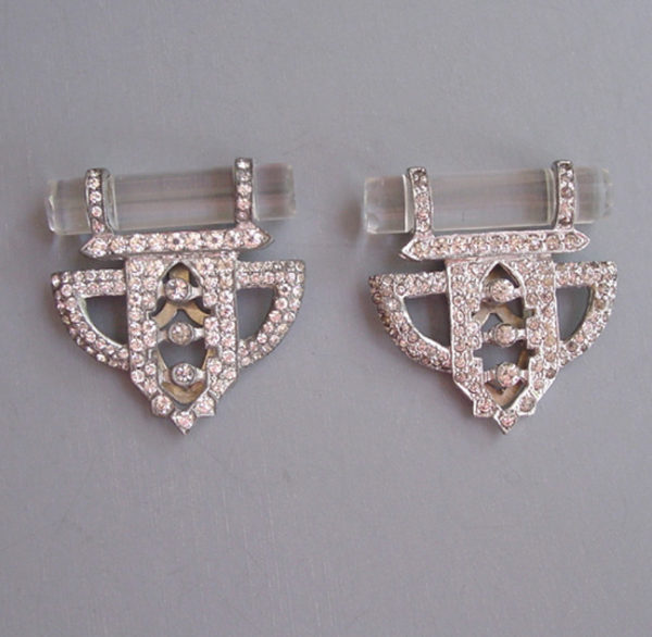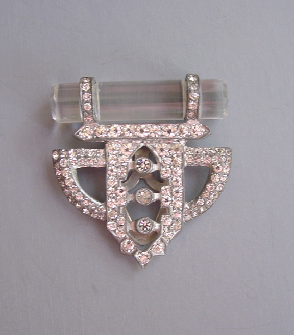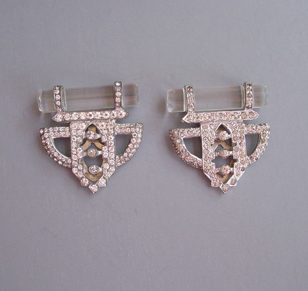 DEROSA Deco set of 2 dress clips with clear rhinestones and glass rodsThese clips are in very good vintage condition, set in white metal and with some stones slightly grayed, and they are from the late 1930s. Another DeRosa piece using glass in a similar way can be seen in Deanna Cera's wonderful book "Jewels of Fantasy" on page 155. As she says in her book, DeRosa is opulent and elegant, and she credits the piece in her book to designer Elvira de Rosa circa 1940. This price is for the set of two clips. View View View View View View Product #d38675 All items in excellent vintage condition unless otherwise noted.