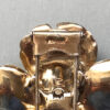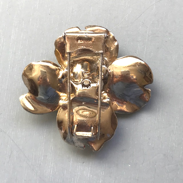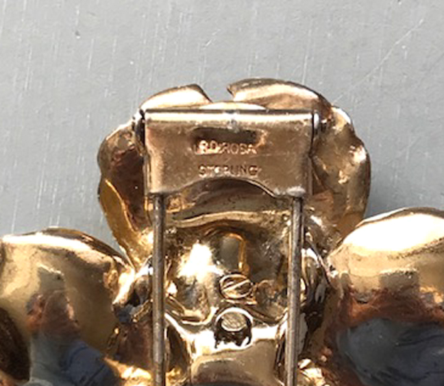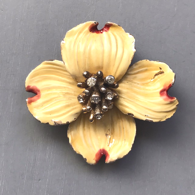 Description DEROSA dogwood blossom fur clip with yellow and red enameled petals and clear rhinestone stamen. It is a match to the DeRosa necklace here on this site. It is signed on the back of the flower "R DeRosa" and on the clasp "sterling" and it is 2" by 2". There is some missing enamel here and there, and this was made in the 940s. DeRosa made such unusual pieces and they didn't seem to make very many of each of their designs. The lovely Dogwood flower is said to be the symbol of hope and rebirth. The last two photos show this with the matching necklace which is for sale elsewhere on this web site. View View View Product #42642