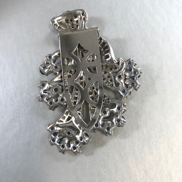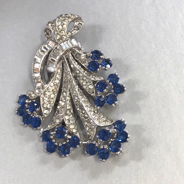 DescriptionDEROSA dress clip with clear round and baguette rhinestones and medium blue rhinestones in a rhodium plated silver setting, 2-3/4" by 2" and circa 1940s. Signed "R DeRosa" on the clip back, this is in excellent vintage condition with brilliant rhinestones.