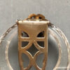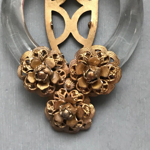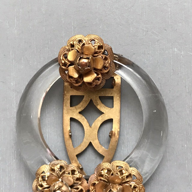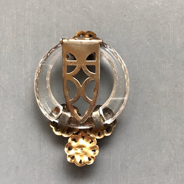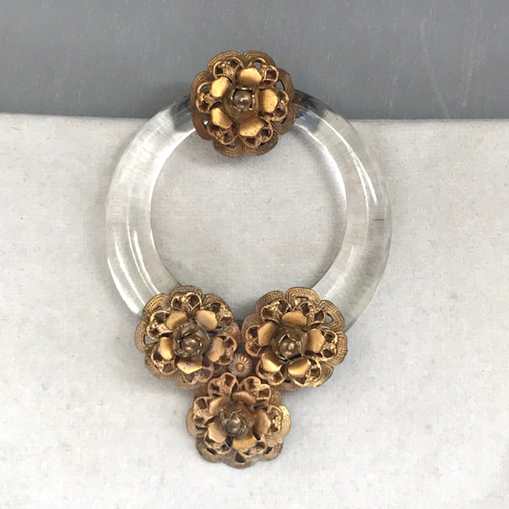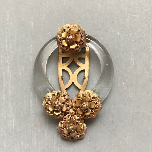 DescriptionDEROSA dress clip of a clear glass circle with a lightly faceted edge and multi-layered brass flowers, each with a bead center.