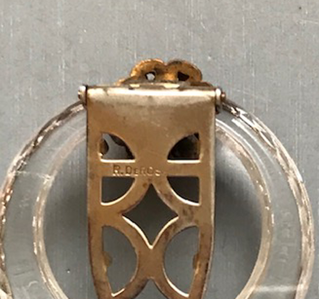 It is signed "R DeRosa" on the back, from the 1940s and it is 2-3/4" long and 2" wide. DeRosa made several varieties of the circle clip, and this original design art work illustrates another one of them HERE, art work shown for fun and not a part of this price. View View View View View Product #42494