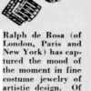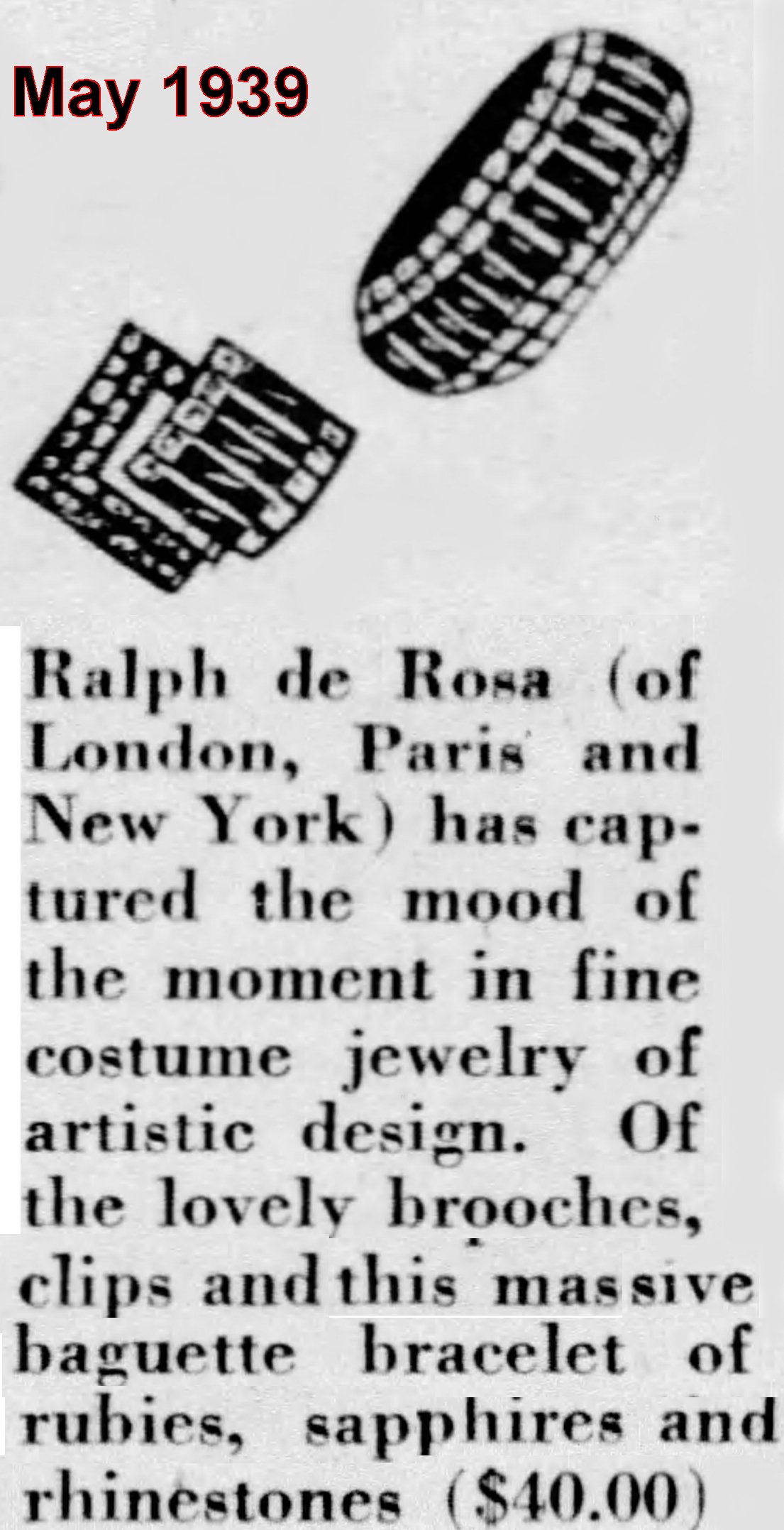 We have a jpg of an advertisement for it dated May of 1939. This ad shows the matching bracelet, too. The price for the clip in 1939 was a lot of money back then. This ad claims that DeRosa had locations in other countries, but that is an advertising exaggeration because we have seen no proof that he was in any country other than the USA. Another place to see the wonderful matching bracelet by DeRosa is in Deanna Cera's book "Jewels of Fantasy" on page 151.