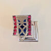 Description DEROSA dress clip with patriotic red, clear and blue invisibly set rhinestones, a gleaming beauty. The red and blue sparkling baguettes are channel set in rhodium plated silver and the clear rhinestones set them off perfectly and are very brilliant as well. It's 2" by 1-3/4" and in excellent vintage condition, signed "R DeRosa" on the back and made in 1939.