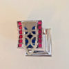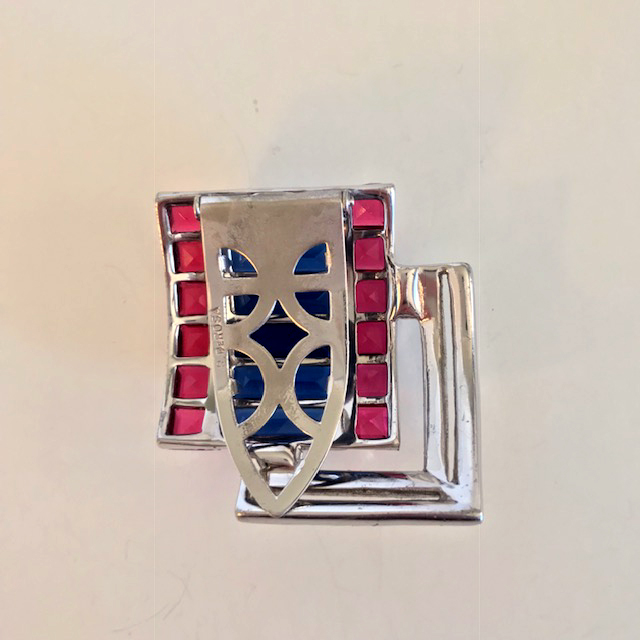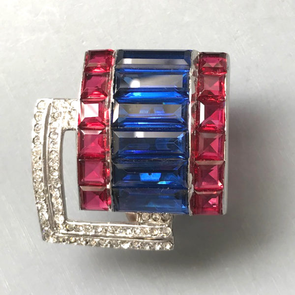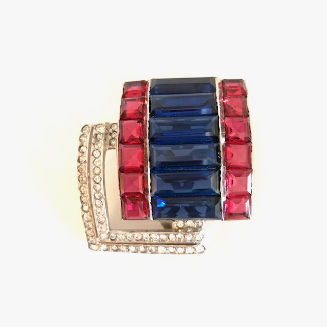 Description DEROSA dress clip with patriotic red, clear and blue invisibly set rhinestones, a gleaming beauty.  The red and blue sparkling baguettes are channel set in rhodium plated silver and the clear rhinestones set them off perfectly and are very brilliant as well.  It's 2" by 1-3/4" and in excellent vintage condition, signed "R DeRosa" on the back and made in 1939.