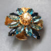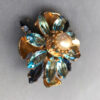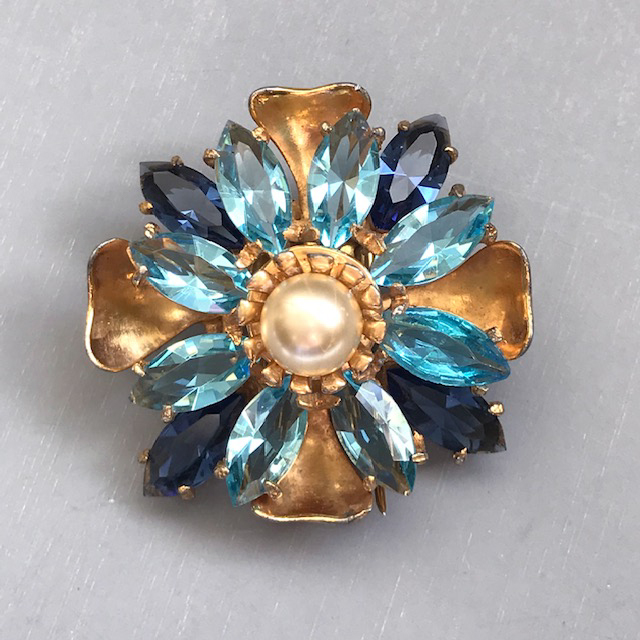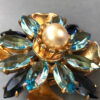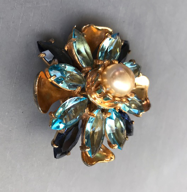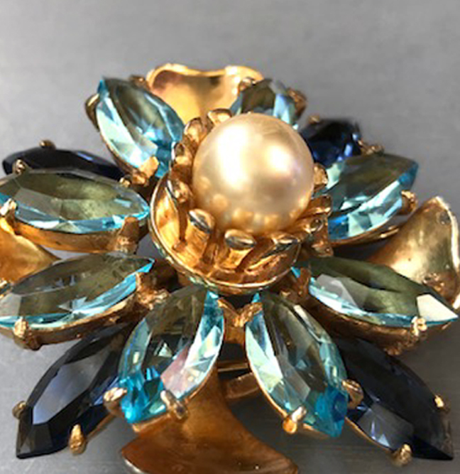 DEROSA flower fur clip with very special unfoiled blue and aqua marquis shaped rhinestones, a glass pearl center in a crown-like setting, and gold plated sterling silver petals