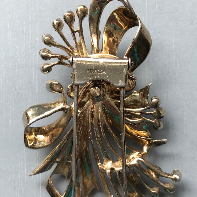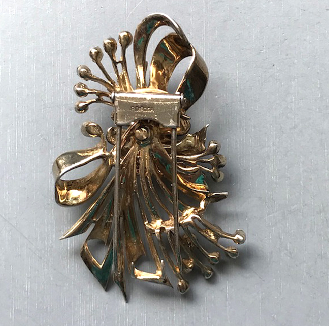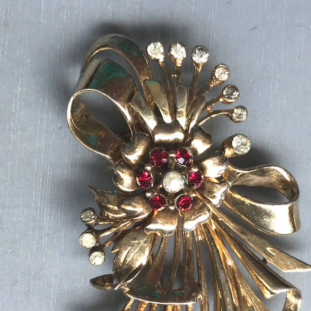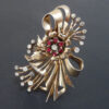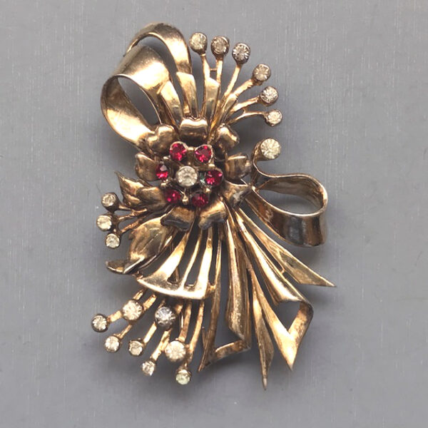DEROSA flowers and ribbons fur clip with red and clear rhinestone flower in a gold plated sterling silver settingProduct #42738 All items in excellent vintage condition unless otherwise noted.