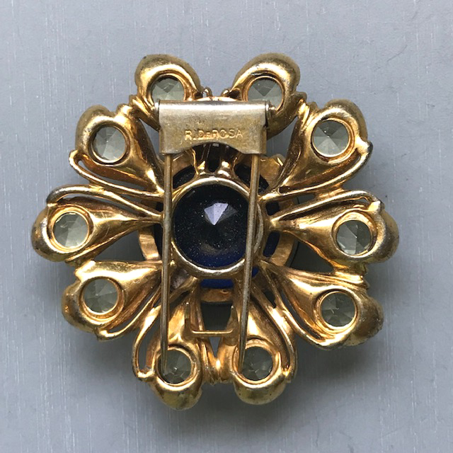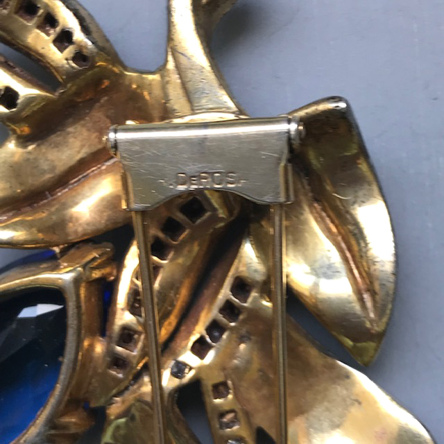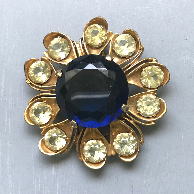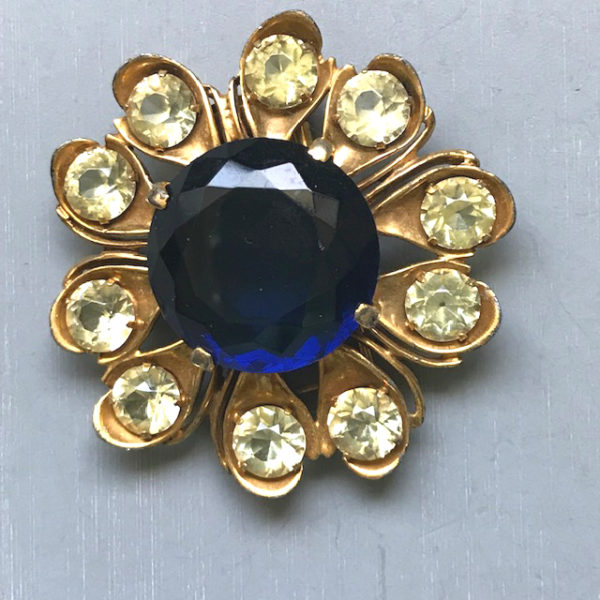 DEROSA fur clip with brilliant blue and yellow rhinestones nestled in cupped petal shapes of a gold plated settingProduct #41852 All items in excellent vintage condition unless otherwise noted.
