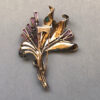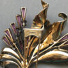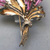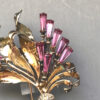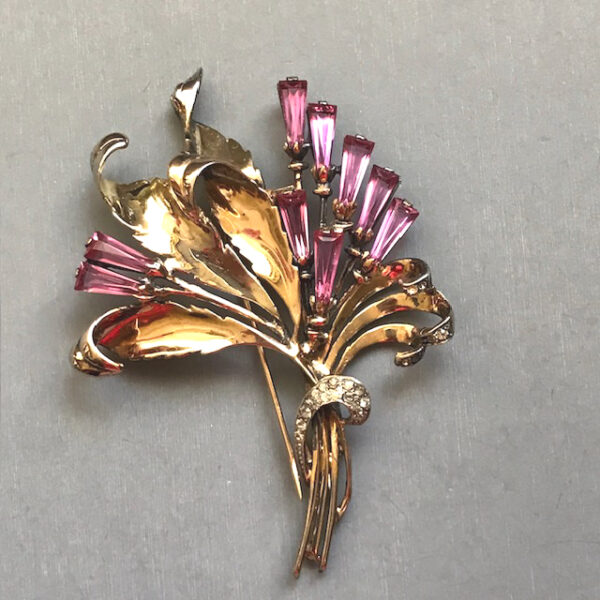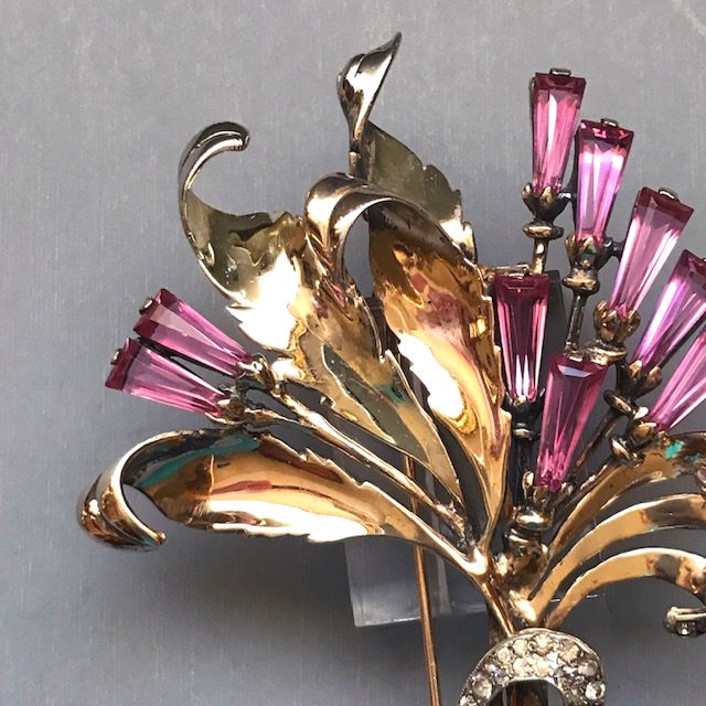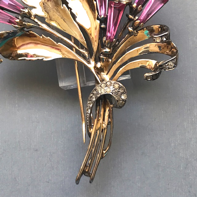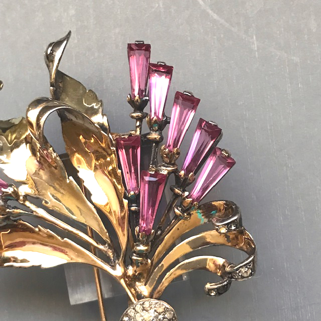DEROSA fur clip with sparkling unfoiled pink rhinestones and clear rhinestone accents, gold plated sterling silverSigned on the back "R DeRosa sterling, it is 3-1/3" by 2-5/8" and was made in the 1940s. It is shaped like a stylized bouquet of flowers, really lovely. To read more about DEROSA jewelry click HERE for our reference page and gallery. View View View View View Product #d42673 All items in excellent vintage condition unless otherwise noted.