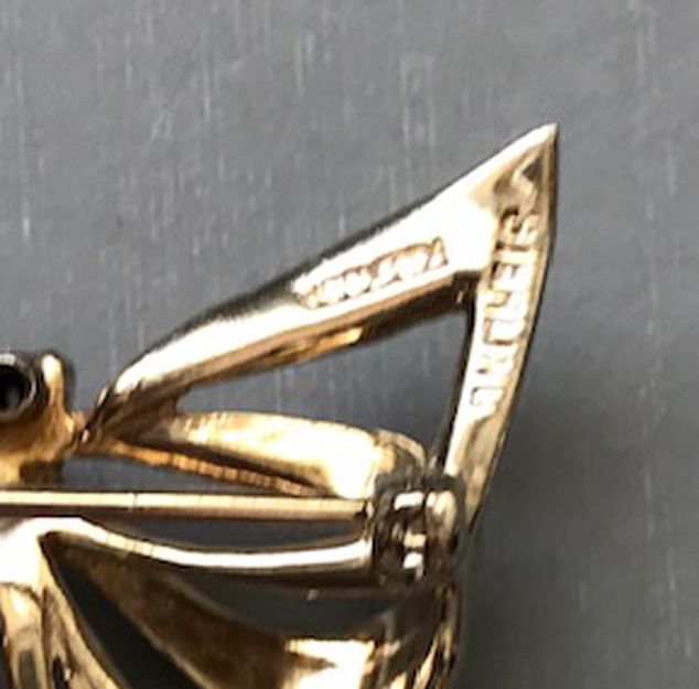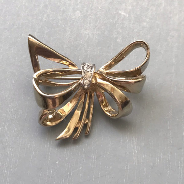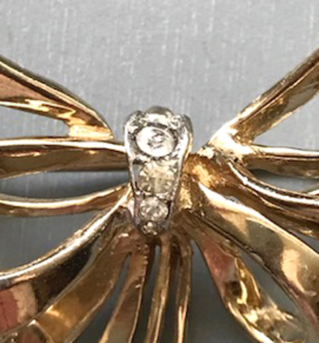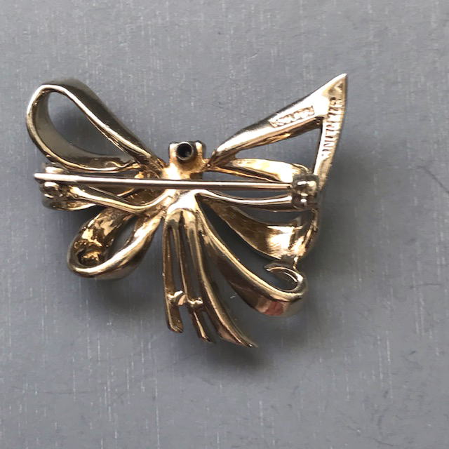 Description DEROSA dainty gold plated sterling silver bow brooch with tiny clear rhinestones, signed on the back "R DeRosa sterling" and made in the the 1940s, it is 1-1/2" by 1-1/4". View View View View Product #41814