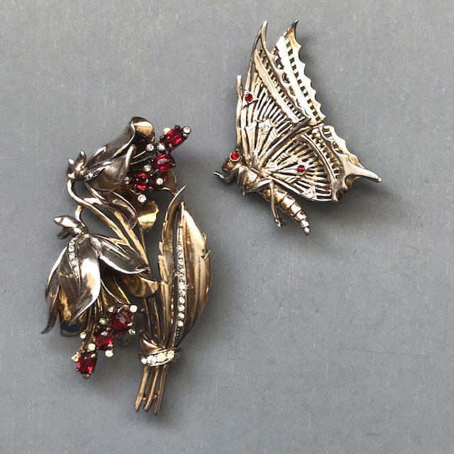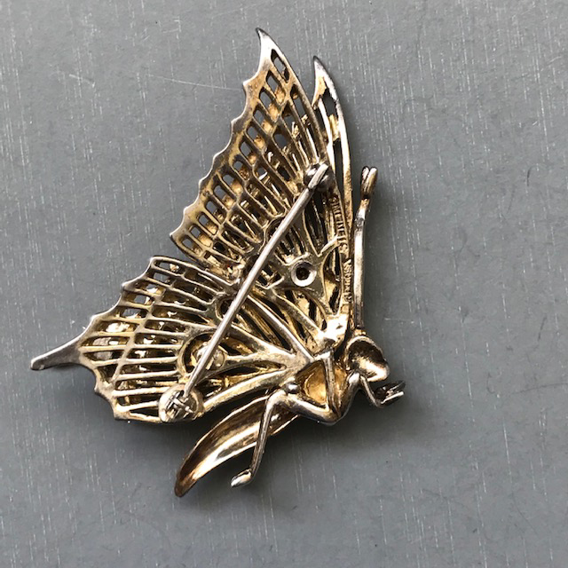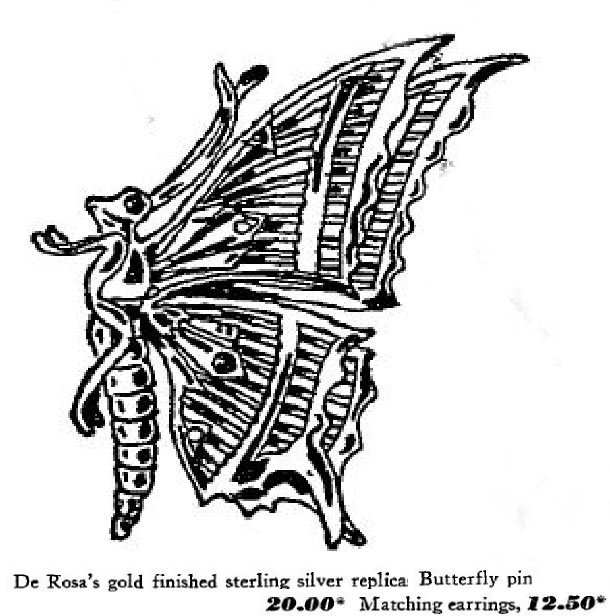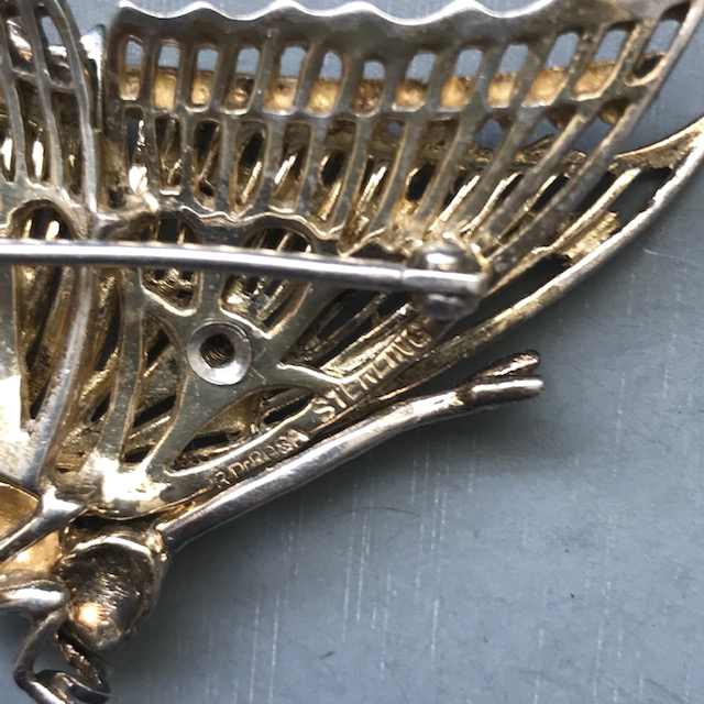 This is signed "R DeRosa sterling" on the back.  The last photo shows a really fun way to wear two brooches at once, the flower and the butterfly, just as an idea, but only the butterfly is included in this price.  There is an ad for this brooch HERE that dates it to 1948.