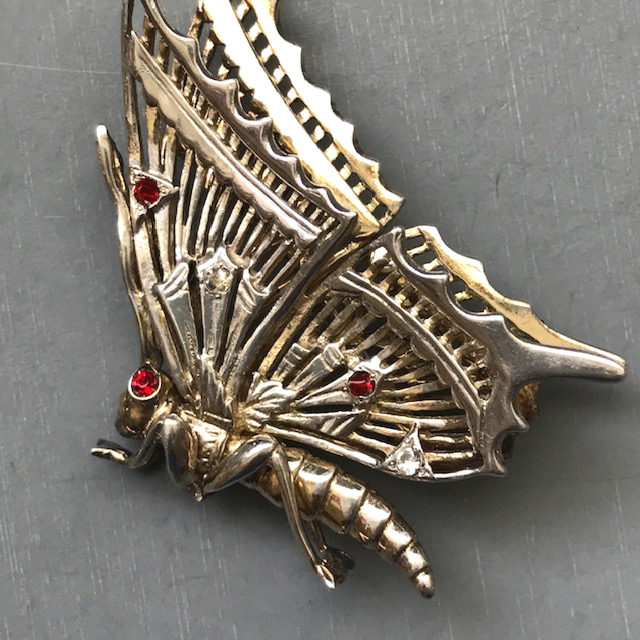 Description DEROSA gold plated sterling silver butterfly brooch with clear and red rhinestones made in about 1948, 2-1/8".