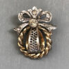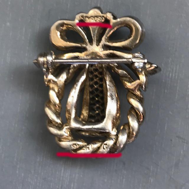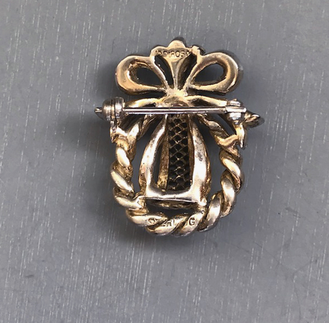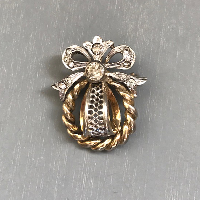 DEROSA dainty gold plated sterling silver small fur clip with a bow at the top, a gold tone wreath shape and a pierced ribbon in the centerProduct #42503 All items in excellent vintage condition unless otherwise noted.