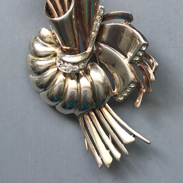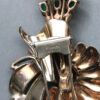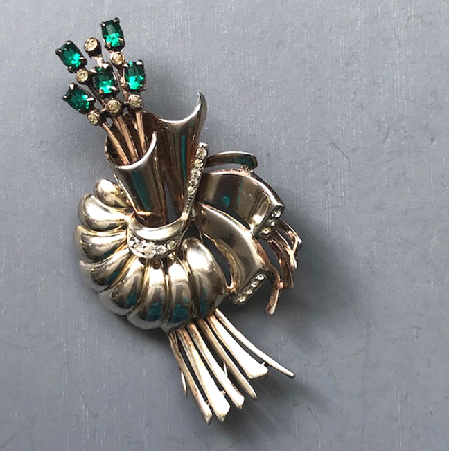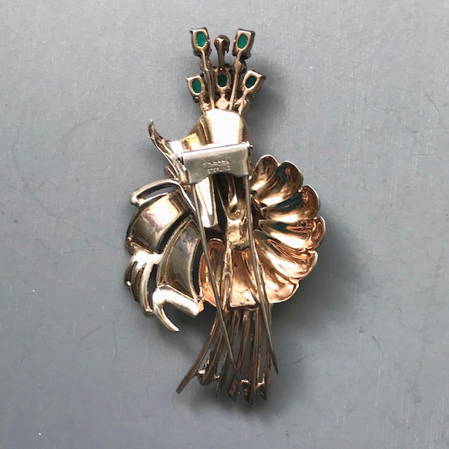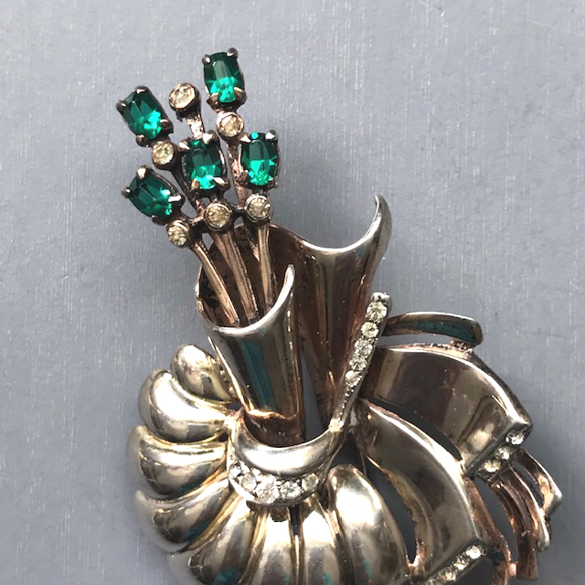 DEROSA green and clear rhinestones stylized flower and stamen fur clip in a gold plated sterling silver settingProduct #42368 All items in excellent vintage condition unless otherwise noted.