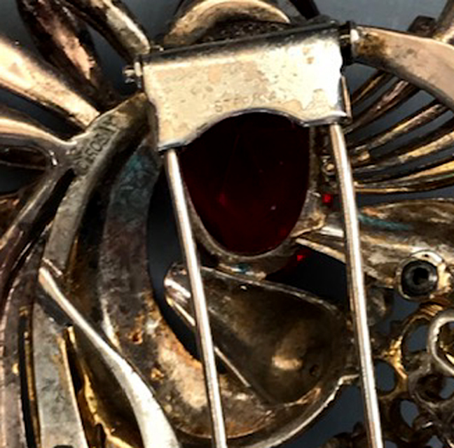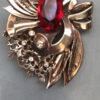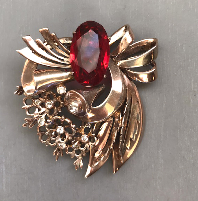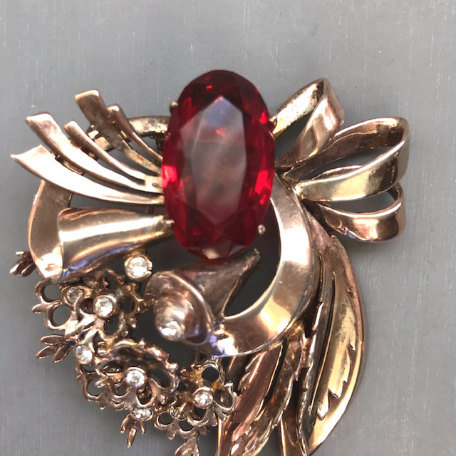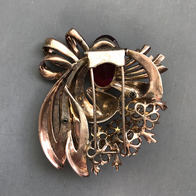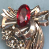 Description DEROSA intricate bows and flowers fur clip with a red unfoiled oval rhinestone accented by clear rhinestones in a gold plated sterling silver setting from the 1940s. Note the wonderful detail of the applied leaves on the bottom right, typical of DeRosa companies' interesting designs. Signed "R DeRosa sterling" on the back, it is a nice size 2-5/8" by 2-1/4". We have had this same clip in purple, HERE shown for only for fun and not for sale with this clip. View View ViewViewView Product #42479