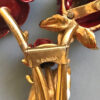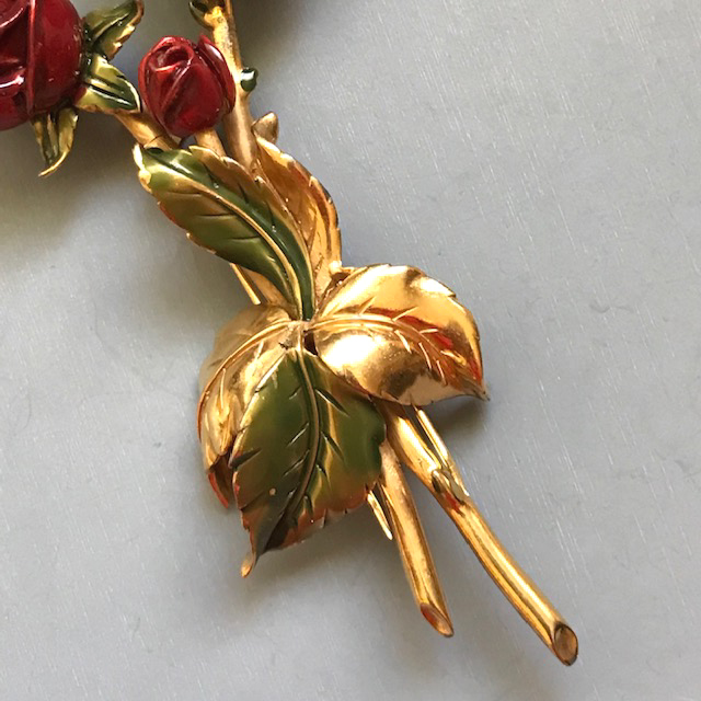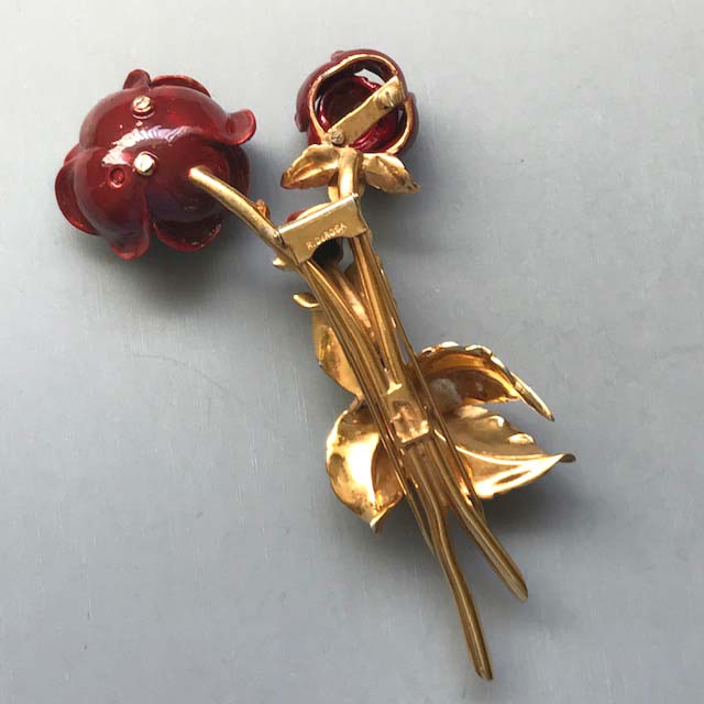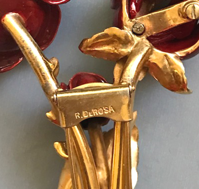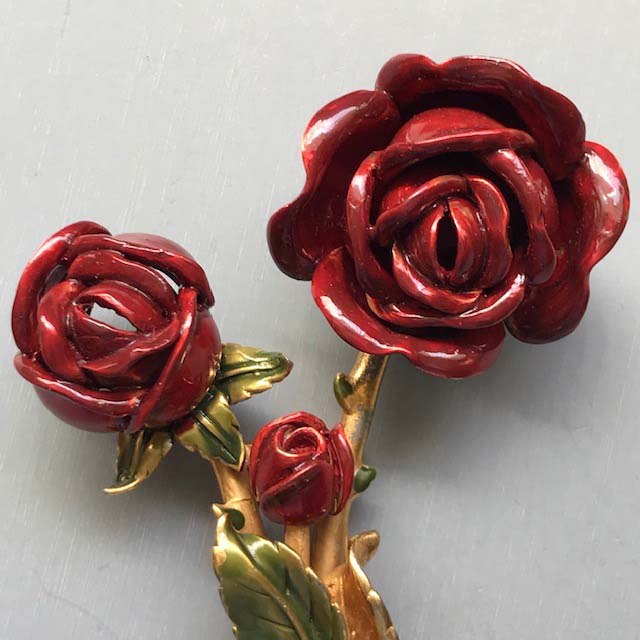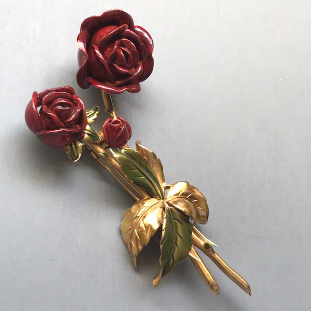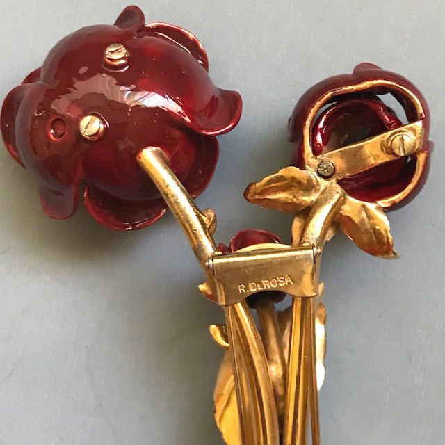 DEROSA large and rare red enameled roses fur clip in a rich wine red with the beautiful translucent green enameled leaves, 5"To read more and see many photographs of wonderful DEROSA jewelry click HERE for our reference pages and gallery. View View View View View View View Product #42566 All items in excellent vintage condition unless otherwise noted.