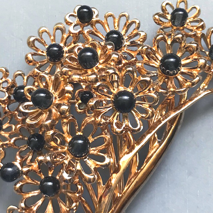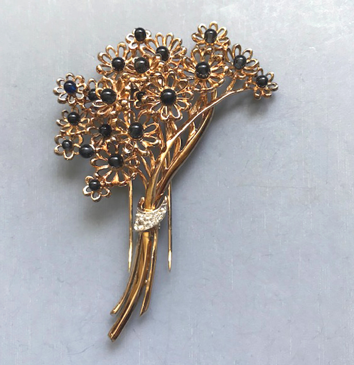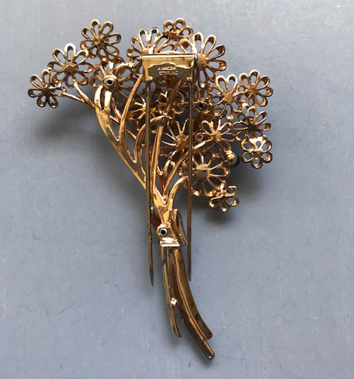 DEROSA large flower bouquet fur clip of lacy looking flowers with blue glass bead centersTo read more about DEROSA jewelry click HERE for our reference page and gallery. View View View Product #42570 All items in excellent vintage condition unless otherwise noted.