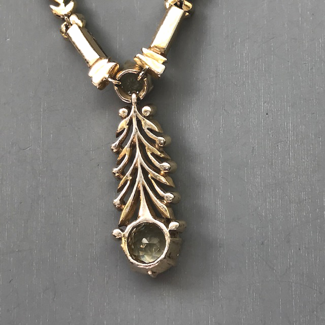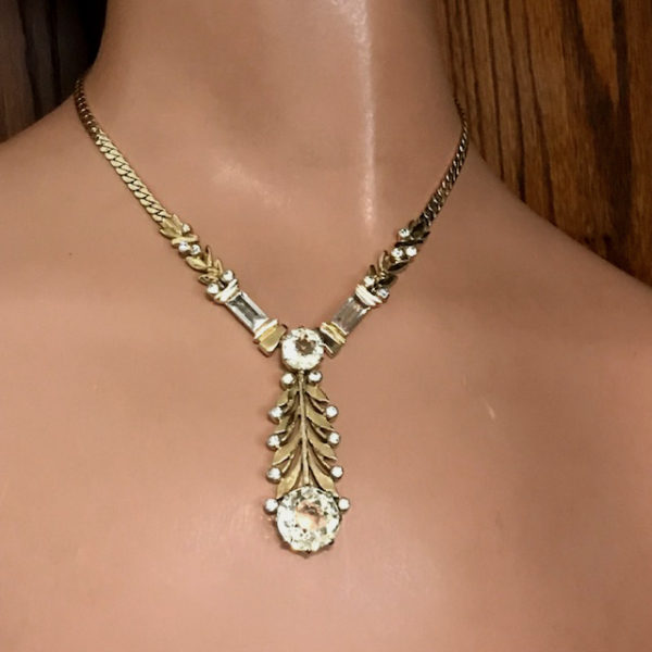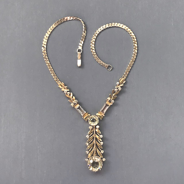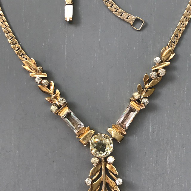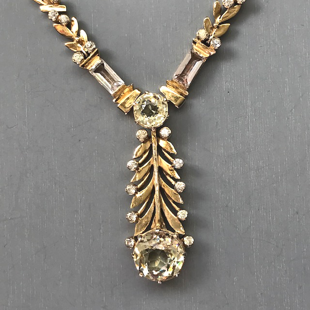 DEROSA necklace, a brilliant and elegant piece created with pale yellow and clear rhinestonesNecklaces by DeRosa are even more rare than their clips and brooches, and this one is a real treasure. To read all about DEROSA jewelry click HERE for our reference page and gallery. View View View View View View Product #41778 All items in excellent vintage condition unless otherwise noted.