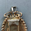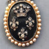 Description DEROSA black enameled brooch with gold plated sterling silver setting and clear rhinestones, signed "R DeRosa sterling". This regal enameled black oval has a crown, three fleur-de-lis with clear rhinestones and glass pearls in a gold plated setting. It is circled with glass pearls all the way around.