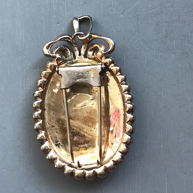 There is a flip-up loop so that it can also be worn on a chain or black ribbon as a necklace. Made in the later 1940s, it is 2" long. Some of this black enameled jewelry group was called "Victorian Jewelry" in the DeRosa advertisements, including an ad in Harper's Bazaar from 1947. View View View View Product #42398
