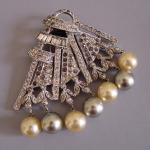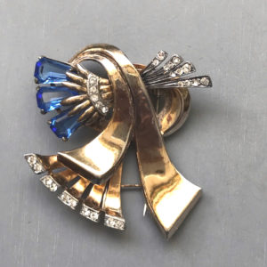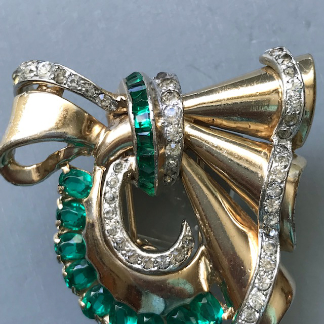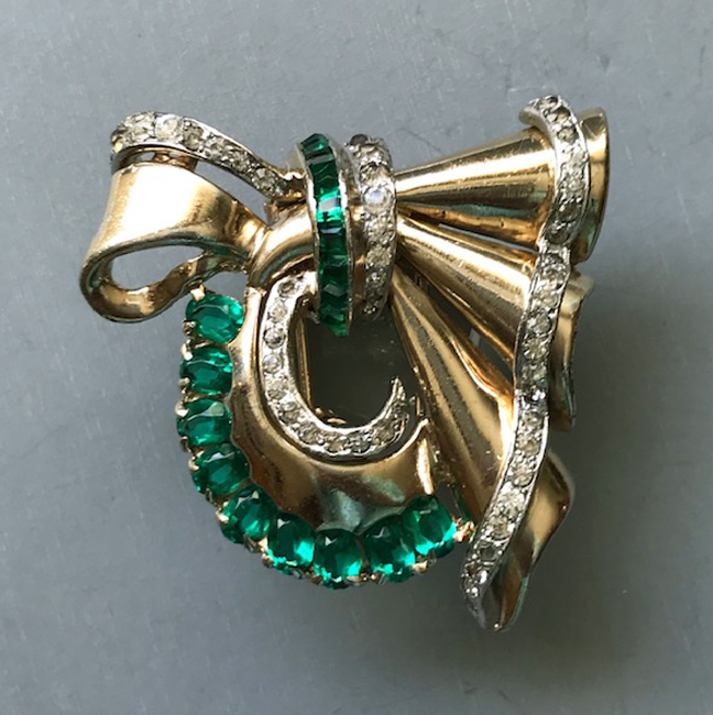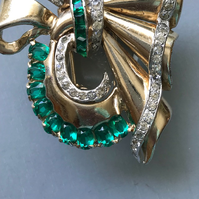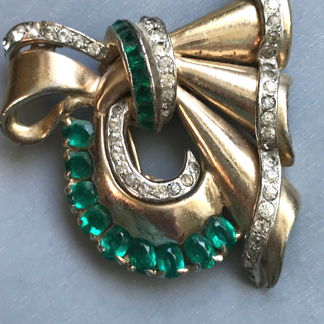DEROSA Retro ribbon and bow fur clip with emerald green and clear rhinestones in a gold plated settingView View View Product #42305 All items in excellent vintage condition unless otherwise noted.