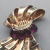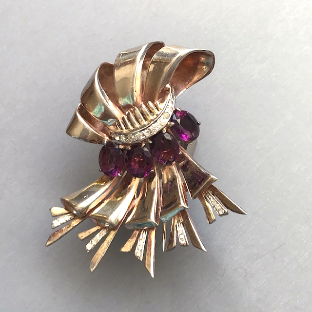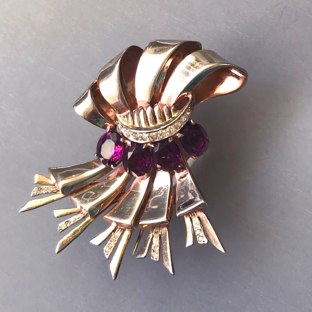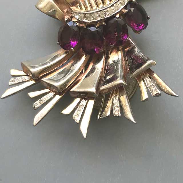 DEROSA Retro bows fur clip with purple and clear rhinestones in a gold plated sterling silver settingProduct #42306 All items in excellent vintage condition unless otherwise noted.