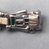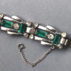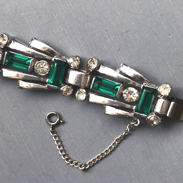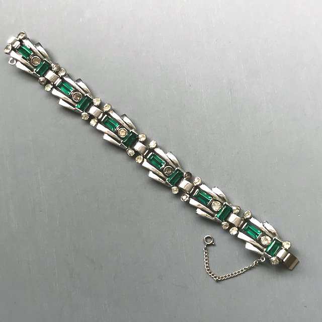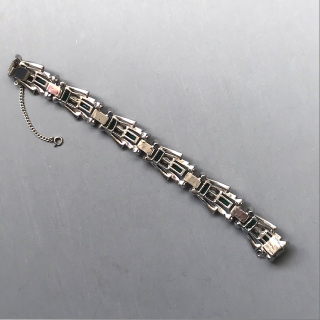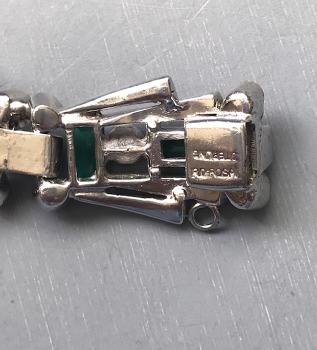 DescriptionDEROSA sparkling emerald green baguettes and clear rhinestones bracelet set in sterling silver, made in the 1940s. It is 6-1/2" wearable length by 5/8" wide and has it's original safety chain.