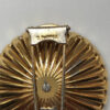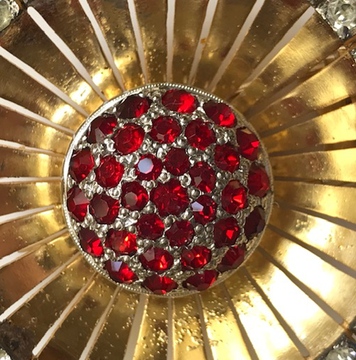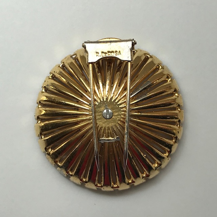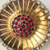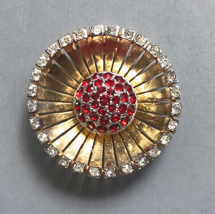 DEROSA sparkling round and deeply cupped fur clip with red rhinestones set on a dome in the center and brilliant clear rhinestones all around the edgeProduct #42562 All items in excellent vintage condition unless otherwise noted.
