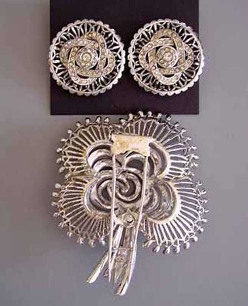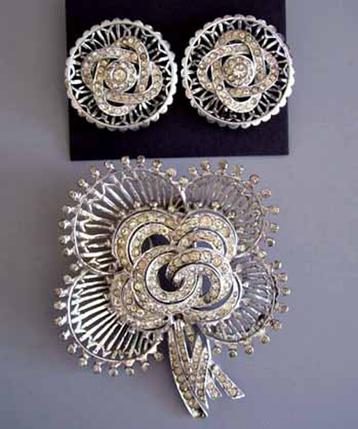 Description DeROSA rhodium plated sterling and clear rhinestones fur clip and earrings made in 1947 according to a magazine ad from that year.  The swirling and pierced design is beautiful and the lover's knots and wire work filigree add even more interest.  The clip is 3" long and clip back earrings are 1-1/4" and they are signed "DeRosa".  These are sparkling, beautiful and in excellent condition, everything you want a piece of vintage jewelry to be.  The last photo is a jpg of the advertisement for this set.