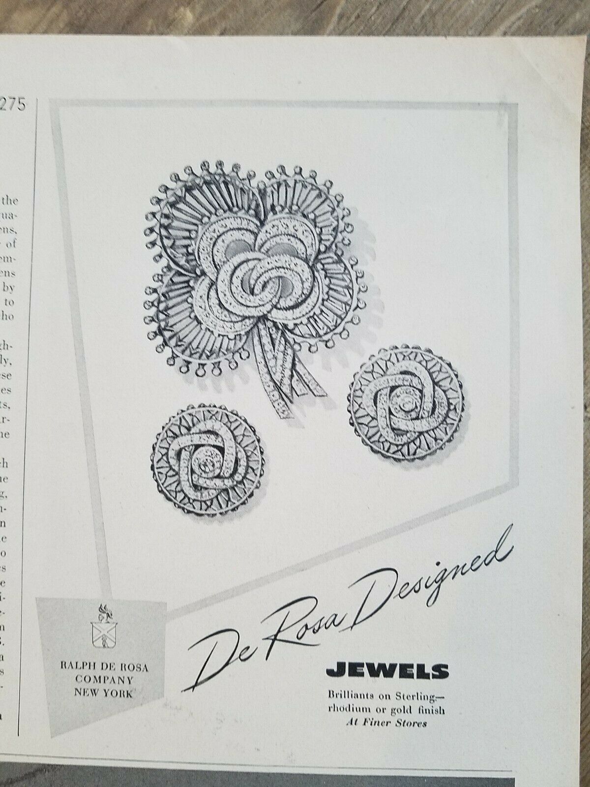 DeROSA sterling silver and clear rhinestones fur clip and earrings, 1947To read more about DEROSA jewelry click HERE for our reference page and gallery. View Product #d21228 All items in excellent vintage condition unless otherwise noted.