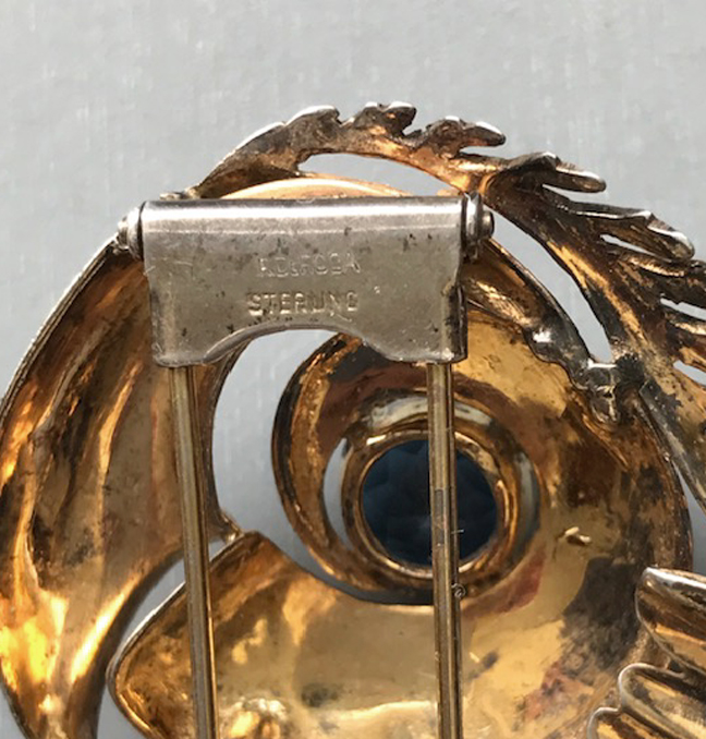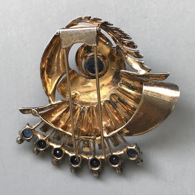 DEROSA gold plated sterling Retro style fur clip with sapphire colored blue rhinestonesProduct #41240 All items in excellent vintage condition unless otherwise noted.