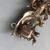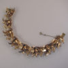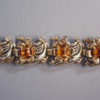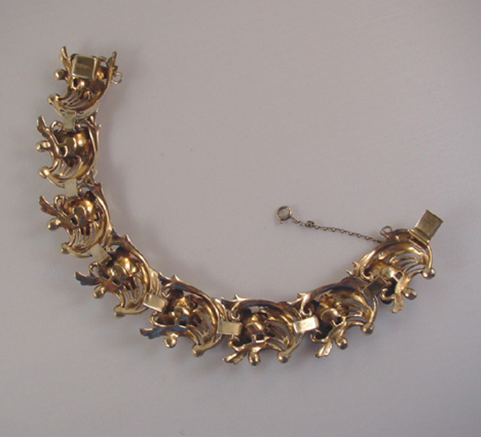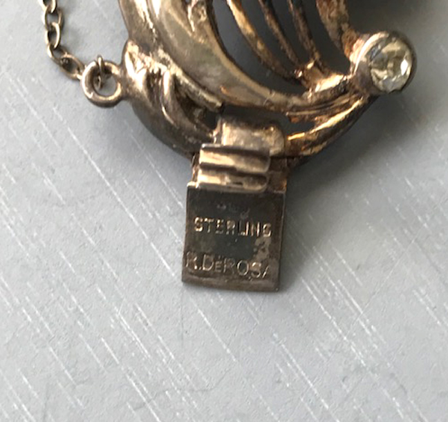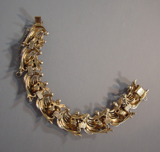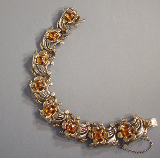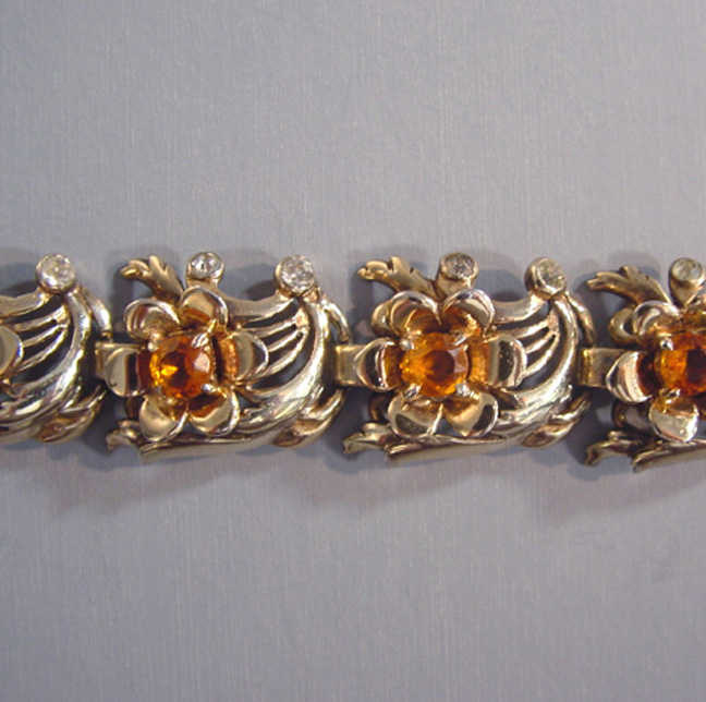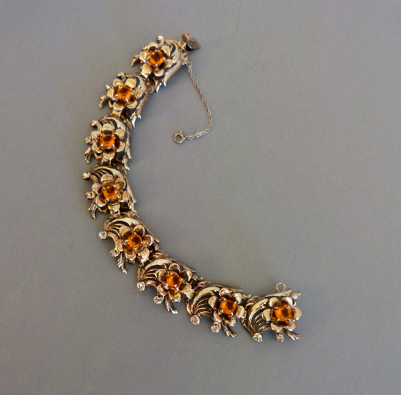 DescriptionDEROSA bracelet with flowers of topaz colored rhinestones in a gold plated sterling setting with clear rhinestones set within swirls, circa 1940. Each flower has cupped petals and behind each flower is a pierced and curved design that makes me think of flowers on the wind! It has it's safety chain, and it is 7" by 3/4". It is marked "DeRosa sterling" on the back of the clasp in tiny letters. DeRosa bracelets are a bit difficult to find, and this is a really nice one. Made in the 1940s, this is in excellent vintage condition. ViewView View View View Product #d36297