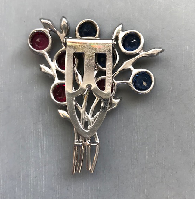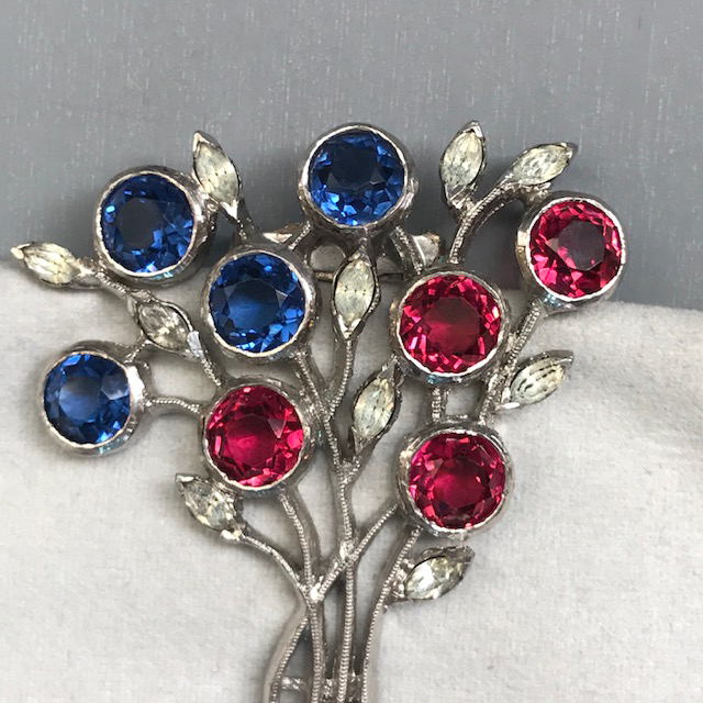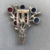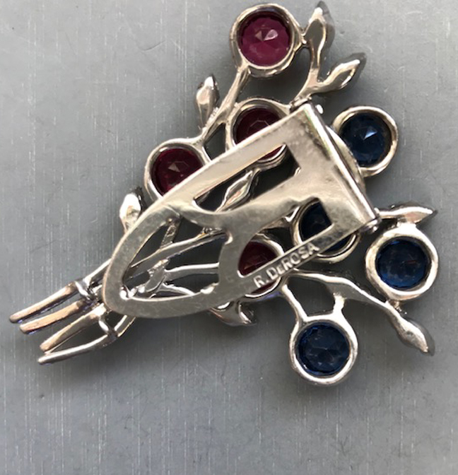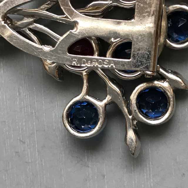 DEROSA tree dress clip with rich red and blue rhinestones along with clear rhinestone marquis set in silverProduct #42477 All items in excellent vintage condition unless otherwise noted.