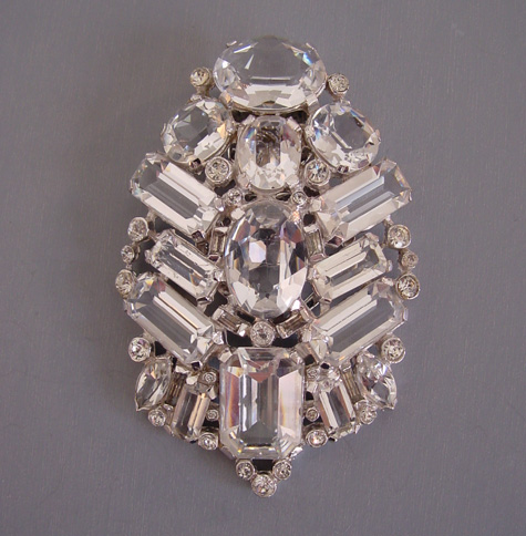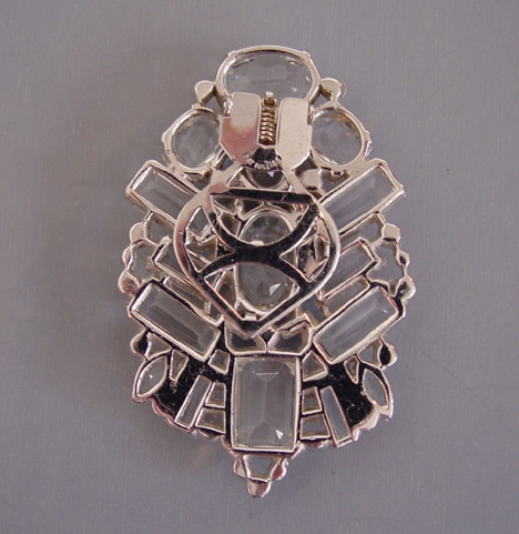 It is marked on clip back "pat 1852188" which is 1931, Elisha A Phinney for George Fuller. The clip is 3" by 2", a perfect size. While this somewhat resembles an Eisenberg from the front, the clip findings are not the type Eisenberg used so they didn't make it. No matter who did make it, it's a dazzling piece with high quality stones and in excellent condition. View Product #63725