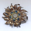 DUJAY sparkling open flower brooch with a brilliant clear rhinestone center surrounded by a halo of smaller clear rhinestone, then dainty leaves enameled in blue, black and yellow